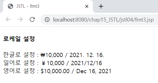 <%@page import="java.util.Date"%> <%@ page language="java" contentType="text/html; charset=UTF-8" pageEncoding="UTF-8"%> <%@ taglib prefix="c" uri="http://java.sun.com/jsp/jstl/core" %> <%@ taglib prefix="fmt" uri="http://java.sun.com/jsp/jstl/fmt" %> <!DOCTYPE html> <html> <head> <meta charset="UTF-8"> <meta name="viewport" content="width=device-width, initial-scale=1.0"> <title>JSTL - fmt3</title> </head> <body> <h4>로케일 설정</h4> <c:set var="today" value="<%=new Date() %>"/> 한글로 설정 : <fmt:setLocale value="ko_kr"/> <fmt:formatNumber value="10000" type="currency"/> / <fmt:formatDate value="${today }"/><br> 일어로 설정 : <fmt:setLocale value="ja_JP"/> <fmt:formatNumber value="10000" type="currency"/> / <fmt:formatDate value="${today }"/><br> 영어로 설정 : <fmt:setLocale value="en_US"/> <fmt:formatNumber value="10000" type="currency"/> / <fmt:formatDate value="${today }"/><br> </body> </html>