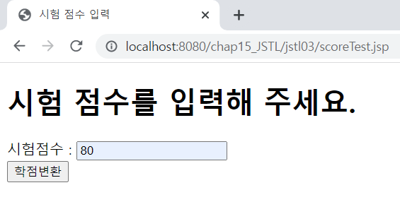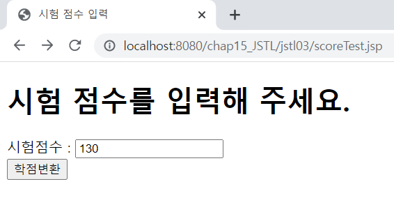 <%@ page language="java" contentType="text/html; charset=UTF-8" pageEncoding="UTF-8"%> <!DOCTYPE html> <html> <head> <meta charset="UTF-8"> <meta name="viewport" content="width=device-width, initial-scale=1.0"> <title>시험 점수 입력</title> </head> <body> <h1>시험 점수를 입력해 주세요.</h1> <form action="scoreResult2.jsp"> 시험점수 : <input type="text" name="score"><br> <input type="submit" value="학점변환"> </form> </body> </html><%@ page language="java" contentType="text/html; charset=UTF-8" pageEncoding="UTF-8"%> <%@ taglib prefix="c" uri="http://java.sun.com/jsp/jstl/core" %> <% request.setCharacterEncoding("utf-8"); %> <!DOCTYPE html> <html> <head> <meta charset="UTF-8"> <meta name="viewport" content="width=device-width, initial-scale=1.0"> <title>학점 변환 화면</title> </head> <body> <c:set var="score" value="${param.score }"/> <!-- param.score를 score 변수에 할당 --> <h1>시험 점수 <c:out value="${score }"/></h1> <c:choose> <c:when test="${score >= 0 && score <= 100 }"> <c:choose> <c:when test="${score >= 90 && score <= 100 }"> <h1>A학점 입니다.</h1> </c:when> <c:when test="${score >= 80 && score <= 90 }"> <h1>B학점 입니다.</h1> </c:when> <c:when test="${score >= 70 && score <= 80 }"> <h1>C학점 입니다.</h1> </c:when> <c:when test="${score >= 60 && score <= 70 }"> <h1>D학점 입니다.</h1> </c:when> <c:otherwise> <h1>F학점 입니다.</h1> </c:otherwise> </c:choose> </c:when> <c:otherwise> <h1>점수를 잘못 입력했습니다. 다시 입력하세요.</h1> <a href="scoreTest.jsp">점수 입력</a> </c:otherwise> </c:choose> </body> </html>