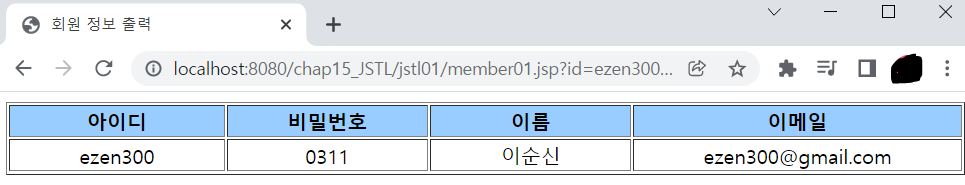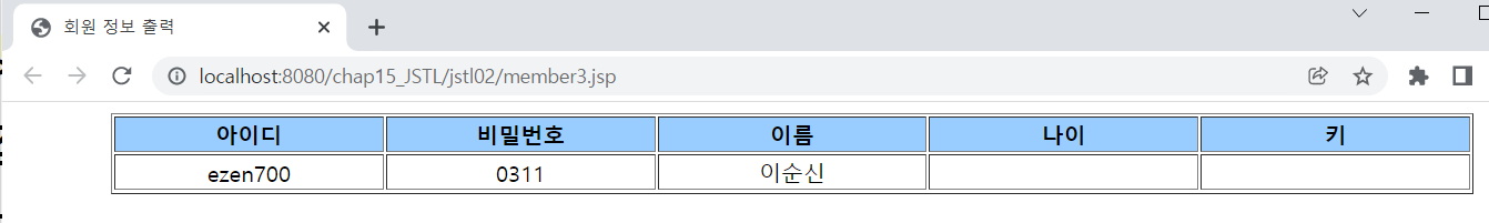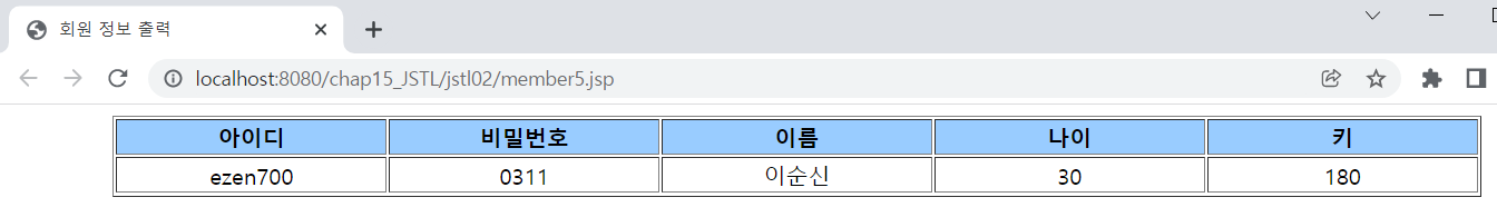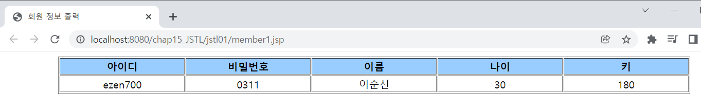 <%@ page language="java" contentType="text/html; charset=UTF-8" pageEncoding="UTF-8"%> <!-- core 태그 라이브러리를 사용하기 위해서 반드시 선언해야 함 --> <%@ taglib prefix="c" uri="http://java.sun.com/jsp/jstl/core" %> <% request.setCharacterEncoding("utf-8"); %> <!-- <c:set> 태그 이용해 변수 선언함 value 속성에는 EL 사용해서 초기화 --> <c:set var="id" value="ezen700" scope="page"/> <c:set var="pwd" value="0311" scope="page"/> <c:set var="name" value="${'이순신' }" scope="page"/> <c:set var="age" value="${30 }" scope="page"/> <c:set var="height" value="${180 }" scope="page"/> <!DOCTYPE html> <html> <head> <meta charset="UTF-8"> <meta name="viewport" content="width=device-width, initial-scale=1.0"> <title>회원 정보 출력</title> </head> <body> <table border="1" align="center"> <tr align="center" bgcolor="#99ccff"> <td width="7%"><b>아이디</b></td> <td width="7%"><b>비밀번호</b></td> <td width="7%"><b>이름</b></td> <td width="7%"><b>나이</b></td> <td width="7%"><b>키</b></td> </tr> <tr align="center"> <td>${id }</td> <!-- EL로 변수에 바로 접근하여 값 출력 --> <td>${pwd }</td> <td>${name }</td> <td>${age }</td> <td>${height }</td> </tr> </table> </body> </html>
