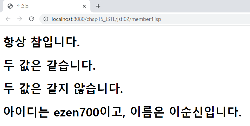 <%@page import="kr.co.ezenac.jstl.MemberBean"%> <%@ page language="java" contentType="text/html; charset=UTF-8" pageEncoding="UTF-8"%> <!-- core 태그 라이브러리를 사용하기 위해서 반드시 선언해야 함 --> <%@ taglib prefix="c" uri="http://java.sun.com/jsp/jstl/core" %> <% request.setCharacterEncoding("utf-8"); %> <c:set var="id" value="ezen700" scope="page"/> <c:set var="pwd" value="0311" scope="page"/> <c:set var="name" value="${'이순신' }" scope="page"/> <c:set var="age" value="${30 }" scope="page"/> <c:set var="height" value="${180 }" scope="page"/> <!DOCTYPE html> <html> <head> <meta charset="UTF-8"> <meta name="viewport" content="width=device-width, initial-scale=1.0"> <title>조건문</title> </head> <body> <c:if test="${true }"> <h1>항상 참입니다.</h1> </c:if> <c:if test="${11 == 11 }"> <h1>두 값은 같습니다.</h1> </c:if> <c:if test="${11 != 31 }"> <h1>두 값은 같지 않습니다.</h1> </c:if> <c:if test="${(id=='ezen700') && (name=='이순신')}"> <h1>아이디는 ${id }이고, 이름은 ${name }입니다.</h1> </c:if> </body> </html>