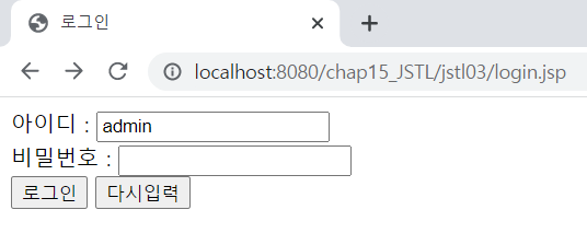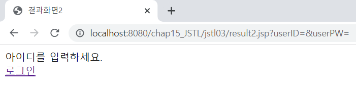 <%@ page language="java" contentType="text/html; charset=UTF-8" pageEncoding="UTF-8"%> <%@ taglib prefix="c" uri="http://java.sun.com/jsp/jstl/core" %> <!-- c:set 이용해 pageContext 내장 객체의 컨텍스트 이름을 변수 contextPath에 설정함 --> <c:set var="contextPath" value="${pageContext.request.contextPath }"/> <!DOCTYPE html> <html> <head> <meta charset="UTF-8"> <meta name="viewport" content="width=device-width, initial-scale=1.0"> <title>로그인</title> </head> <body> <form action="result2.jsp"> 아이디 : <input type="text" name="userID" size="20"><br> 비밀번호 : <input type="password" name="userPW" size="20"><br> <input type="submit" value="로그인"> <input type="reset" value="다시입력"><br><br> </form> </body> <<%@ page language="java" contentType="text/html; charset=UTF-8" pageEncoding="UTF-8"%> <%@ taglib prefix="c" uri="http://java.sun.com/jsp/jstl/core" %> <% request.setCharacterEncoding("utf-8"); %> <!DOCTYPE html> <html> <head> <meta charset="UTF-8"> <meta name="viewport" content="width=device-width, initial-scale=1.0"> <title>결과화면2</title> </head> <body> <c:if test="${empty param.userID }"> <!-- empty 연산자를 이용해 ID 값이 비었는지 체크 --> 아이디를 입력하세요. <br> <a href="login.jsp">로그인</a> </c:if> <c:if test="${not empty param.userID }"> <!-- ID가 null 아님 체크 --> <c:if test="${param.userID == 'admin' }"> <!-- ID가 admin이면 관리자 화면 출력 --> <h1>관리자로 로그인 했습니다.</h1> <form> <input type="button" value="회원정보 수정하기"> <input type="button" value="회원정보 삭제하기"> </form> </c:if> <c:if test="${param.userID != 'admin' }"> <!-- ID가 admin이 아니면 로그인 메세지 출력 --> <h1>환영합니다. <c:out value="${param.userID }"/>님!</h1> </c:if> </c:if> </body> </html>