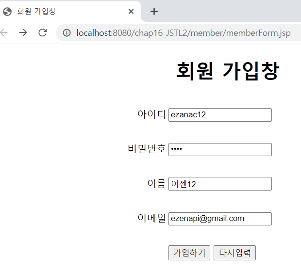 <%@ page language="java" contentType="text/html; charset=UTF-8" pageEncoding="UTF-8"%> <!DOCTYPE html> <html> <head> <meta charset="UTF-8"> <meta name="viewport" content="width=device-width, initial-scale=1.0"> <title>회원 가입창</title> </head> <body> <form action="memberAction.jsp"> <h1 style="text-align: center;">회원 가입창</h1> <table align="center"> <tr> <td width="200"> <p align="right">아이디</p> </td> <td width="400"> <input type="text" name="id"> </td> </tr> <tr> <td width="200"> <p align="right">비밀번호</p> </td> <td width="400"> <input type="password" name="pwd"> </td> </tr> <tr> <td width="200"> <p align="right">이름</p> </td> <td width="400"> <input type="text" name="name"> </td> </tr> <tr> <td width="200"> <p align="right">이메일</p> </td> <td width="400"> <input type="text" name="email"> </td> </tr> <tr> <td width="200"> <p align="right"> </p> </td> <td width="400"> <input type="submit" value="가입하기"> <input type="reset" value="다시입력"> </td> </tr> </table> </form> </body> </html><%@page import="kr.co.ezenac.member.MemberBean"%> <%@page import="java.util.List"%> <%@page import="kr.co.ezenac.member.MemberDAO"%> <%@ page language="java" contentType="text/html; charset=UTF-8" pageEncoding="UTF-8"%> <%@ taglib prefix="c" uri="http://java.sun.com/jsp/jstl/core" %> <%@ taglib prefix="fmt" uri="http://java.sun.com/jsp/jstl/fmt" %> <% request.setCharacterEncoding("utf-8"); %> <!DOCTYPE html> <html> <head> <meta charset="UTF-8"> <meta name="viewport" content="width=device-width, initial-scale=1.0"> <title>Insert title here</title> <jsp:useBean id="m" class="kr.co.ezenac.member.MemberBean"/> <jsp:setProperty property="*" name="m"/> <% MemberDAO memberDAO = new MemberDAO(); memberDAO.addMember(m); List<MemberBean> membersList = memberDAO.listMembers(); request.setAttribute("membersList", membersList); /* 조회한 회원 정보를 request에 바인딩함 */ %> </head> <body> <jsp:forward page="membersList.jsp"/> <!-- membersList.jsp로 포워딩함 --> </body> </html>package kr.co.ezenac.member; import java.sql.Date; public class MemberBean { private String id; private String pwd; private String name; private String email; private Date joinDate; public MemberBean() { // TODO Auto-generated constructor stub } public MemberBean(String id, String pwd, String name, String email) { //super(); this.id = id; this.pwd = pwd; this.name = name; this.email = email; } public String getId() { return id; } public void setId(String id) { this.id = id; } public String getPwd() { return pwd; } public void setPwd(String pwd) { this.pwd = pwd; } public String getName() { return name; } public void setName(String name) { this.name = name; } public String getEmail() { return email; } public void setEmail(String email) { this.email = email; } public Date getJoinDate() { return joinDate; } public void setJoinDate(Date joinDate) { this.joinDate = joinDate; } }package kr.co.ezenac.member; import java.sql.Connection; import java.sql.Date; import java.sql.PreparedStatement; import java.sql.ResultSet; import java.sql.SQLException; import java.util.ArrayList; import java.util.List; import javax.naming.Context; import javax.naming.InitialContext; import javax.naming.NamingException; import javax.sql.DataSource; public class MemberDAO { private Connection conn; private PreparedStatement pstmt; private DataSource dataFactory; public MemberDAO() { try { Context ctx = new InitialContext(); Context envContext = (Context)ctx.lookup("java:/comp/env"); //JNDI에 접근하기 위해 기본경로를 지정 //톰캣 context.xml에 설정한 name 값인 jdbc/oracle을 이용해 톰캣이 미리 연결한 DataSource를 받아옴 dataFactory = (DataSource)envContext.lookup("jdbc/oracle"); } catch (NamingException e) { e.printStackTrace(); } } public List<MemberBean> listMembers() { List<MemberBean> list = new ArrayList<MemberBean>(); try { conn = dataFactory.getConnection(); //DataSource를 이용해 DB에 연결함 String query = "SELECT * FROM T_MEMBER"; System.out.println(query); pstmt = conn.prepareStatement(query); //prepareStatement()메서드에 SQL문을 전달해 객체 생성함 ResultSet rs = pstmt.executeQuery(); //미리 설정한 SQL문을 실행함 while(rs.next()) { String id = rs.getString("id"); String pwd = rs.getString("pwd"); String name = rs.getString("name"); String email = rs.getString("email"); Date joinDate = rs.getDate("joinDate"); //조회한 레코드의 각 컬럼 값을 받아옴 MemberBean vo = new MemberBean(); vo.setId(id); vo.setPwd(pwd); vo.setName(name); vo.setEmail(email); vo.setJoinDate(joinDate); //각 컬럼 값을 다시 MemberVO 객체의 속성에 설정함 list.add(vo); //설정된 MemberVO 객체를 다시 ArrayList에 저장함 } rs.close(); pstmt.close(); conn.close(); } catch (SQLException e) { e.printStackTrace(); } return list; //조회한 레코드의 개수만큼 MemberVO 객체를 저장한 ArrayList를 반환함 } public void addMember(MemberBean MemberBean) { try { conn = dataFactory.getConnection(); // DataSource를 이용해 DB 연결 String id = MemberBean.getId(); // 테이블에 저장할 회원 정보 받아옴 String pwd = MemberBean.getPwd(); String name = MemberBean.getName(); String email = MemberBean.getEmail(); String query = "insert into t_member (id, pwd, name, email) values (?, ?, ?, ?)"; System.out.println("prepareStatement: " + query); pstmt = conn.prepareStatement(query); pstmt.setString(1, id); //insert문의 ?에 순서대로 회원 정보 세팅 pstmt.setString(2, pwd); pstmt.setString(3, name); pstmt.setString(4, email); pstmt.executeUpdate(); pstmt.close(); } catch (SQLException e) { e.printStackTrace(); } } }<%@ page language="java" contentType="text/html; charset=UTF-8" pageEncoding="UTF-8"%> <%@ taglib prefix="c" uri="http://java.sun.com/jsp/jstl/core" %> <%@ taglib prefix="fmt" uri="http://java.sun.com/jsp/jstl/fmt" %> <% request.setCharacterEncoding("utf-8"); %> <!DOCTYPE html> <html> <head> <meta charset="U