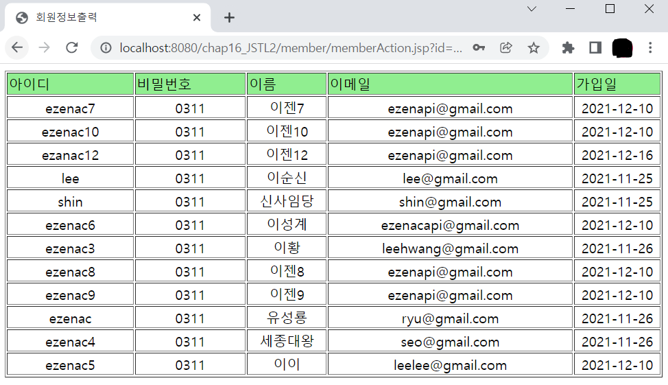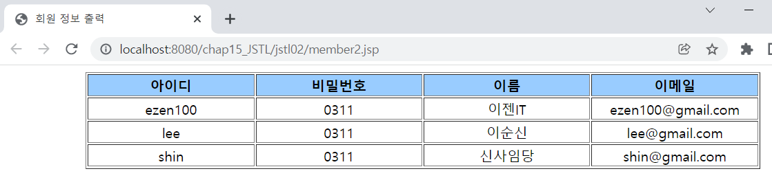 import java.sql.Date; public class MemberBean { private String id; private String pwd; private String name; private String email; private Date joinDate; public MemberBean() { // TODO Auto-generated constructor stub } public MemberBean(String id, String pwd, String name, String email) { //super(); this.id = id; this.pwd = pwd; this.name = name; this.email = email; } public String getId() { return id; } public void setId(String id) { this.id = id; } public String getPwd() { return pwd; } public void setPwd(String pwd) { this.pwd = pwd; } public String getName() { return name; } public void setName(String name) { this.name = name; } public String getEmail() { return email; } public void setEmail(String email) { this.email = email; } public Date getJoinDate() { return joinDate; } public void setJoinDate(Date joinDate) { this.joinDate = joinDate; } }<%@page import="java.util.ArrayList"%> <%@page import="java.util.List"%> <%@page import="kr.co.ezenac.jstl.MemberBean"%> <%@ page language="java" contentType="text/html; charset=UTF-8" pageEncoding="UTF-8"%> <!-- core 태그 라이브러리를 사용하기 위해서 반드시 선언해야 함 --> <%@ taglib prefix="c" uri="http://java.sun.com/jsp/jstl/core" %> <% request.setCharacterEncoding("utf-8"); %> <% List<MemberBean> membersList = new ArrayList<>(); MemberBean m1 = new MemberBean("ezen100", "0311", "이순신", "ezen100@gmail.com"); MemberBean m2 = new MemberBean("ezen200", "0311", "신사임당", "ezen200@gmail.com"); MemberBean m3 = new MemberBean("ezen300", "0311", "이도", "ezen300@gmail.com"); membersList.add(m1); membersList.add(m2); membersList.add(m3); %> <c:set var="membersList" value="<%=membersList %>"/> <!DOCTYPE html> <html> <head> <meta charset="UTF-8"> <meta name="viewport" content="width=device-width, initial-scale=1.0"> <title>회원 정보 출력</title> </head> <body> <table border="1" align="center"> <tr align="center" bgcolor="#99ccff"> <td width="7%"><b>아이디</b></td> <td width="7%"><b>비밀번호</b></td> <td width="7%"><b>이름</b></td> <td width="7%"><b>이메일</b></td> </tr> <!-- 반복문 수행하면서 membersList에 저장된 MemberBean 객체가 차례대로 member 할당됨 --> <c:forEach var="member" items="${membersList }"> <tr align="center"> <td>${member.id }</td> <td>${member.pwd }</td> <td>${member.name }</td> <td>${member.email }</td> </tr> </c:forEach> </table> </body> </html>