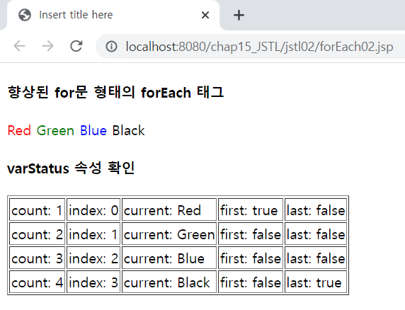 <%@ page language="java" contentType="text/html; charset=UTF-8" pageEncoding="UTF-8"%> <%@ taglib prefix="c" uri="http://java.sun.com/jsp/jstl/core" %> <!DOCTYPE html> <html> <head> <meta charset="UTF-8"> <meta name="viewport" content="width=device-width, initial-scale=1.0"> <title>JSTL - forEach 태그</title> </head> <body> <h4>향상된 for문 형태의 forEach 태그</h4> <% String[] rgba = {"Red", "Green", "Blue", "Black"}; %> <c:forEach items="<%=rgba %>" var="c"> <span style="color: ${c};">${c }</span> </c:forEach> <h4>varStatus 속성 확인</h4> <table border="1"> <c:forEach items="<%=rgba %>" var="c" varStatus="loop"> <tr> <td>count: ${loop.count }</td> <td>index: ${loop.index }</td> <td>current: ${loop.current }</td> <td>first: ${loop.first }</td> <td>last: ${loop.last }</td> </tr> </c:forEach> </table> </body> </html>