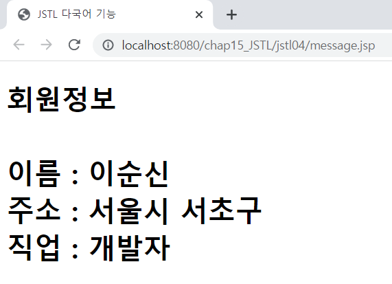 mem.job = developer<%@ page language="java" contentType="text/html; charset=UTF-8" pageEncoding="UTF-8"%> <%@ taglib prefix="c" uri="http://java.sun.com/jsp/jstl/core" %> <%@ taglib prefix="fmt" uri="http://java.sun.com/jsp/jstl/fmt" %> <!DOCTYPE html> <html> <head> <meta charset="UTF-8"> <meta name="viewport" content="width=device-width, initial-scale=1.0"> <title>JSTL 다국어 기능</title> </head> <body> <%-- <fmt:setLocale value="ko_KR"/> --%> <!-- locale을 한글로 지정 --> <fmt:setLocale value="en_US"/> <!-- locale을 영어로 지정 --> <h1> 회원정보<br><br> <fmt:bundle basename="kr.co.ezenac.resource.member"> <!-- 패키지 아래 member 프로퍼티 파일 읽어옴 --> 이름 : <fmt:message key="mem.name"/><br> <!-- fmt:message 태그의 key 속성에 프로퍼티 파일의 key 지정 --> 주소 : <fmt:message key="mem.address"/><br> 직업 : <fmt:message key="mem.job"/><br> </fmt:bundle> </h1> </body> </html>