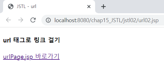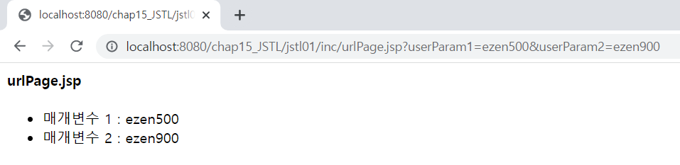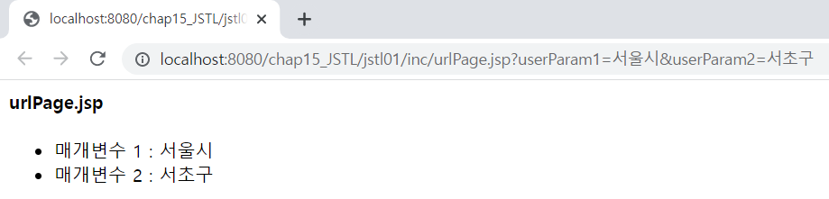 <%@ page language="java" contentType="text/html; charset=UTF-8" pageEncoding="UTF-8"%> <%@ taglib prefix="c" uri="http://java.sun.com/jsp/jstl/core" %> <!DOCTYPE html> <html> <head> <meta charset="UTF-8"> <meta name="viewport" content="width=device-width, initial-scale=1.0"> <title>JSTL - url</title> </head> <body> <h4>url 태그로 링크 걸기</h4> <c:url value="../jstl01/inc/urlPage.jsp" var="url"> <c:param name="userParam1" value="ezen500"/> <c:param name="userParam2">ezen900</c:param> </c:url> <a href="${url }">urlPage.jsp 바로가기</a> </body> </html><%@ page language="java" contentType="text/html; charset=UTF-8" pageEncoding="UTF-8"%> <h4>urlPage.jsp</h4> <ul> <li>매개변수 1 : ${param.userParam1 }</li> <li>매개변수 2 : ${param.userParam2 }</li> </ul>