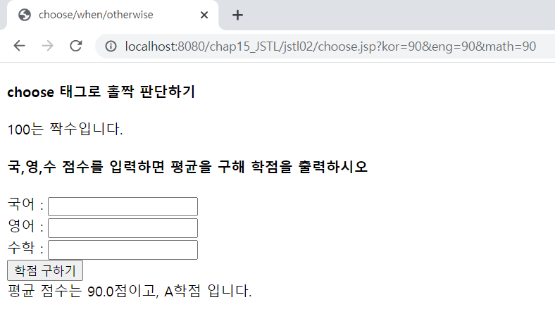 <%@ page language="java" contentType="text/html; charset=UTF-8" pageEncoding="UTF-8"%> <%@ taglib prefix="c" uri="http://java.sun.com/jsp/jstl/core" %> <!DOCTYPE html> <html> <head> <meta charset="UTF-8"> <meta name="viewport" content="width=device-width, initial-scale=1.0"> <title>choose/when/otherwise</title> <c:set var="number" value="100" /> <h4>choose 태그로 홀짝 판단하기</h4> <c:choose> <c:when test="${number mod 2 eq 0 }"> ${number }는 짝수입니다. </c:when> <c:otherwise> ${number }는 홀수입니다. </c:otherwise> </c:choose> <br> <h4>국,영,수 점수를 입력하면 평균을 구해 학점을 출력하시오</h4> <form> 국어 : <input type="text" name="kor"><br> 영어 : <input type="text" name="eng"><br> 수학 : <input type="text" name="math"><br> <input type="submit" value="학점 구하기"> </form> <!-- 모든 과목 점수가 입력되었는지 체크 --> <c:if test="${not (empty param.kor or empty param.eng or empty param.math) }"> <!-- 평균 계산 --> <c:set var="avg" value="${(param.kor + param.eng + param.math) / 3 }"/> 평균 점수는 ${avg }점이고, <!-- 학점 출력 --> <c:choose> <c:when test="${avg >= 90 }">A학점</c:when> <c:when test="${avg >= 80 }">B학점</c:when> <c:when test="${avg >= 70 }">C학점</c:when> <c:when test="${avg >= 60 }">D학점</c:when> <c:otherwise>F학점</c:otherwise> </c:choose> 입니다. </c:if> </head> <body> </body> </html>