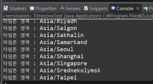 package kr.co.ezenac.util; import java.util.TimeZone; public class TimezoneTest { public static void main(String[] args) { String[] timezone = TimeZone.getAvailableIDs(); for(String zoneId : timezone) { System.out.println("타임존 영역 : " + zoneId); } } }