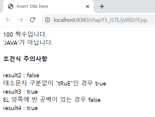<%@ page language="java" contentType="text/html; charset=UTF-8" pageEncoding="UTF-8"%> <%@ taglib prefix="c" uri="http://java.sun.com/jsp/jstl/core" %> <!DOCTYPE html> <html> <head> <meta charset="UTF-8"> <meta name="viewport" content="width=device-width, initial-scale=1.0"> <title>Insert title here</title> </head> <body> <!-- 변수 선언 --> <c:set var="number" value="100"/> <c:set var="string" value="JSP"/> <c:if test="${number mod 2 eq 0 }"> ${number } 짝수입니다.<br> </c:if> <c:if test="${string eq 'JAVA' }" var="result"> 문자열은 JAVA입니다.<br> </c:if> <c:if test="${not result }"> 'JAVA'가 아닙니다.<br> </c:if> <h4>조건식 주의사항</h4> <c:if test="100" var="result2"> EL이 아닌 정수를 지정하면 false </c:if> result2 : ${result2 }<br> <c:if test="tRuE" var="result3"> 대소문자 구분없이 "tRuE"인 경우 true<br> </c:if> result3 : ${result3 }<br> <c:if test="${ true }" var="result4"> EL 양쪽에 빈 공백이 있는 경우 true<br> </c:if> result4 : ${result4 }<br> </body> </html>