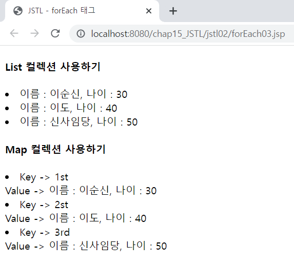 package kr.co.ezenac.jstl; public class Person { private String name; private int age; public Person() { // TODO Auto-generated constructor stub } public Person(String name, int age) { super(); this.name = name; this.age = age; } public String getName() { return name; } public void setName(String name) { this.name = name; } public int getAge() { return age; } public void setAge(int age) { this.age = age; } }<%@page import="java.util.HashMap"%> <%@page import="java.util.Map"%> <%@page import="kr.co.ezenac.jstl.Person"%> <%@page import="java.util.List"%> <%@page import="java.util.LinkedList"%> <%@ page language="java" contentType="text/html; charset=UTF-8" pageEncoding="UTF-8"%> <%@ taglib prefix="c" uri="http://java.sun.com/jsp/jstl/core" %> <!DOCTYPE html> <html> <head> <meta charset="UTF-8"> <meta name="viewport" content="width=device-width, initial-scale=1.0"> <title>JSTL - forEach 태그</title> </head> <body> <h4>List 컬렉션 사용하기</h4> <% List<Person> lists = new LinkedList<>(); lists.add(new Person("이순신", 30)); lists.add(new Person("이도", 40)); lists.add(new Person("신사임당", 50)); %> <c:set var="lists" value="<%=lists %>" /> <c:forEach items="${lists }" var="list"> <li> 이름 : ${list.name }, 나이 : ${list.age } </li> </c:forEach> <h4>Map 컬렉션 사용하기</h4> <% Map<String,Person> maps = new HashMap<>(); maps.put("1st", new Person("이순신", 30)); maps.put("2st", new Person("이도", 40)); maps.put("3rd", new Person("신사임당", 50)); %> <c:set var="maps" value="<%=maps %>"/> <c:forEach items="${maps }" var="map"> <li> Key -> ${map.key }<br> Value -> 이름 : ${map.value.name }, 나이 : ${map.value.age } </li> </c:forEach> </body> </html>