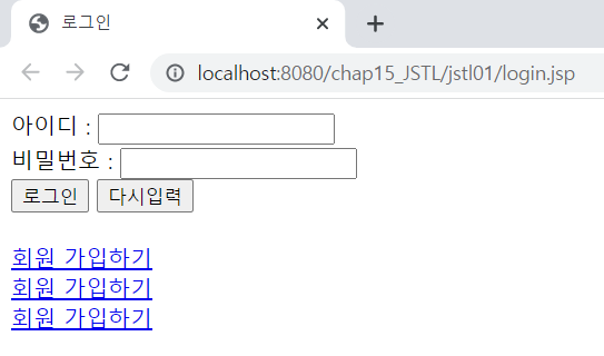<%@ page language="java" contentType="text/html; charset=UTF-8" pageEncoding="UTF-8"%> <%@ taglib prefix="c" uri="http://java.sun.com/jsp/jstl/core" %> <c:set var="contextPath" value="${pageContext.request.contextPath }"/> <!DOCTYPE html> <html> <head> <meta charset="UTF-8"> <meta name="viewport" content="width=device-width, initial-scale=1.0"> <title>로그인</title> </head> <body> <form action="result.jsp"> 아이디 : <input type="text" size="20"><br> 비밀번호 : <input type="password" size="20"><br> <input type="submit" value="로그인"> <input type="reset" value="다시입력"><br><br> <!-- 직접 컨텍스트 이름을 입력해 요청함 --> <a href="http://localhost:8080/chap14_EL/jstl01/memberForm.jsp">회원 가입하기</a><br> <!-- request의 getContextPath() 이용해 컨텍스트 이름을 가져옴 --> <a href="<%=request.getContextPath() %>/jstl01/memberForm.jsp">회원 가입하기</a><br> <!-- 자바 코드 상용하지 않고 pageContext의 속성인 request의 contextPath 속성으로 컨텍스트 이름을 가져옴--> <a href="${contextPath}/jstl01/memberForm.jsp">회원 가입하기</a> </form> </body> </html>