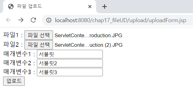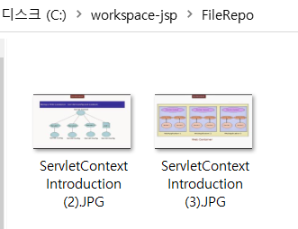 <%@ page language="java" contentType="text/html; charset=UTF-8" pageEncoding="UTF-8"%> <%@ taglib prefix="c" uri="http://java.sun.com/jsp/jstl/core" %> <%@ taglib prefix="fmt" uri="http://java.sun.com/jsp/jstl/fmt" %> <% request.setCharacterEncoding("utf-8"); %> <c:set var="contextPath" value="${pageContext.request.servletContext.contextPath }"/> <!DOCTYPE html> <html> <head> <meta charset="UTF-8"> <meta name="viewport" content="width=device-width, initial-scale=1.0"> <title>파일 업로드</title> </head> <body> <!-- enctype의 속성값 multipart/form-data : 모든 문자를 인코딩하지 않음. form 태그를 통해 파일을 서버로 전송할 때 주로 사용 --> <form action="${contextPath }/upload.do" method="post" enctype="multipart/form-data"> 파일1 : <input type="file" name="file1"><br> 파일2 : <input type="file" name="file2"><br> 매개변수1 : <input type="text" name="param1"><br> 매개변수2 : <input type="text" name="param2"><br> 매개변수3 : <input type="text" name="param3"><br> <input type="submit" value="업로드"> </form> </body> </html>package kr.co.ezenac.fileud; import java.io.File; import java.io.IOException; import java.util.List; import javax.servlet.ServletException; import javax.servlet.annotation.WebServlet; import javax.servlet.http.HttpServlet; import javax.servlet.http.HttpServletRequest; import javax.servlet.http.HttpServletResponse; import org.apache.commons.fileupload.FileItem; import org.apache.commons.fileupload.disk.DiskFileItemFactory; import org.apache.commons.fileupload.servlet.ServletFileUpload; /** * Servlet implementation class FileUpload */ @WebServlet("/upload.do") public class FileUpload extends HttpServlet { private static final long serialVersionUID = 1L; /** * @see HttpServlet#doGet(HttpServletRequest request, HttpServletResponse response) */ protected void doGet(HttpServletRequest request, HttpServletResponse response) throws ServletException, IOException { doHandle(request, response); } /** * @see HttpServlet#doPost(HttpServletRequest request, HttpServletResponse response) */ protected void doPost(HttpServletRequest request, HttpServletResponse response) throws ServletException, IOException { doHandle(request, response); } public void doHandle(HttpServletRequest request, HttpServletResponse response) throws ServletException, IOException { request.setCharacterEncoding("utf-8"); String encoding="utf-8"; File currenDirPath = new File("C:\\workspace-jsp\\FileRepo"); //업로드할 파일 경로 지정 DiskFileItemFactory factory = new DiskFileItemFactory(); factory.setRepository(currenDirPath); //파일 경로 설정 factory.setSizeThreshold(1024*1024); //최대 업로드 파일 크기 설정 ServletFileUpload upload = new ServletFileUpload(factory); try { List<FileItem> items = upload.parseRequest(request); //request객체에서 매개변수를 List로 가져옴 for(int i=0; i<items.size(); i++) { FileItem fileItem = items.get(i); //파일 업로드창에서 업로드된 항목들을 하나씩 가져옴 if(fileItem.isFormField()) { //폼 필드이면 전송된 매개변수 값을 출력함 System.out.println(fileItem.getFieldName() + " = " + fileItem.getString(encoding)); } else { System.out.println("파라미터명 : " + fileItem.getFieldName()); System.out.println("파일명 : " + fileItem.getName()); System.out.println("파일크기 : " + fileItem.getSize() + "bytes"); if(fileItem.getSize() > 0) { int idx = fileItem.getName().lastIndexOf("\\"); if(idx == -1) { idx = fileItem.getName().lastIndexOf("/"); } String fileName = fileItem.getName().substring(idx + 1); File uploadFile = new File(currenDirPath + "\\" + fileName); fileItem.write(uploadFile); //업로드한 파일 이름으로 저장소에 파일을 업로드함 } } } } catch(Exception e) { System.out.println("파일 업로드 중 오류 발생"); e.printStackTrace(); } } }