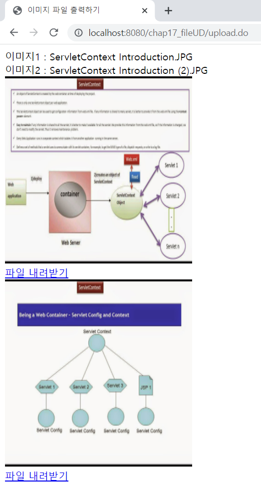 <%@ page language="java" contentType="text/html; charset=UTF-8" pageEncoding="UTF-8"%> <%@ taglib prefix="c" uri="http://java.sun.com/jsp/jstl/core" %> <%@ taglib prefix="fmt" uri="http://java.sun.com/jsp/jstl/fmt" %> <% request.setCharacterEncoding("utf-8"); %> <c:set var="contextPath" value="${pageContext.request.servletContext.contextPath }"/> <!DOCTYPE html> <html> <head> <meta charset="UTF-8"> <meta name="viewport" content="width=device-width, initial-scale=1.0"> <title>파일 업로드</title> </head> <body> <!-- enctype의 속성값 multipart/form-data : 모든 문자를 인코딩하지 않음. form 태그를 통해 파일을 서버로 전송할 때 주로 사용 --> <form action="${contextPath }/upload.do" method="post" enctype="multipart/form-data"> 파일1 : <input type="file" name="file1"><br> 파일2 : <input type="file" name="file2"><br> 매개변수1 : <input type="text" name="param1"><br> 매개변수2 : <input type="text" name="param2"><br> 매개변수3 : <input type="text" name="param3"><br> <input type="submit" value="업로드"> </form> </body> </html>package kr.co.ezenac.fileud; import java.io.File; import java.io.IOException; import java.util.ArrayList; import java.util.List; import javax.servlet.RequestDispatcher; import javax.servlet.ServletException; import javax.servlet.annotation.WebServlet; import javax.servlet.http.HttpServlet; import javax.servlet.http.HttpServletRequest; import javax.servlet.http.HttpServletResponse; import org.apache.commons.fileupload.FileItem; import org.apache.commons.fileupload.disk.DiskFileItemFactory; import org.apache.commons.fileupload.servlet.ServletFileUpload; /** * Servlet implementation class FileUpload */ @WebServlet("/upload.do") public class FileUpload extends HttpServlet { private static final long serialVersionUID = 1L; /** * @see HttpServlet#doGet(HttpServletRequest request, HttpServletResponse response) */ protected void doGet(HttpServletRequest request, HttpServletResponse response) throws ServletException, IOException { doHandle(request, response); } /** * @see HttpServlet#doPost(HttpServletRequest request, HttpServletResponse response) */ protected void doPost(HttpServletRequest request, HttpServletResponse response) throws ServletException, IOException { doHandle(request, response); } public void doHandle(HttpServletRequest request, HttpServletResponse response) throws ServletException, IOException { request.setCharacterEncoding("utf-8"); String encoding="utf-8"; File currenDirPath = new File("C:\\workspace-jsp\\FileRepo"); //업로드할 파일 경로 지정 DiskFileItemFactory factory = new DiskFileItemFactory(); factory.setRepository(currenDirPath); //파일 경로 설정 factory.setSizeThreshold(1024*1024); //최대 업로드 파일 크기 설정 ServletFileUpload upload = new ServletFileUpload(factory); String fileName = null; List<String> fileList = new ArrayList<>(); //업로드할 파일들을 담아놓을 리스트 try { List<FileItem> items = upload.parseRequest(request); //request객체에서 매개변수를 List로 가져옴 for(int i=0; i<items.size(); i++) { FileItem fileItem = items.get(i); //파일 업로드창에서 업로드된 항목들을 하나씩 가져옴 if(fileItem.isFormField()) { //폼 필드이면 전송된 매개변수 값을 출력함 System.out.println(fileItem.getFieldName() + " = " + fileItem.getString(encoding)); } else { System.out.println("파라미터명 : " + fileItem.getFieldName()); System.out.println("파일명 : " + fileItem.getName()); System.out.println("파일크기 : " + fileItem.getSize() + "bytes"); if(fileItem.getSize() > 0) { int idx = fileItem.getName().lastIndexOf("\\"); if(idx == -1) { idx = fileItem.getName().lastIndexOf("/"); } fileName = fileItem.getName().substring(idx + 1); fileList.add(fileName); //복수개 파일들 add File uploadFile = new File(currenDirPath + "\\" + fileName); fileItem.write(uploadFile); //업로드한 파일 이름으로 저장소에 파일을 업로드함 } } } } catch(Exception e) { System.out.println("파일 업로드 중 오류 발생"); e.printStackTrace(); } request.setAttribute("fileList", fileList); //복수 개의 파일들을 request 저장소에 바인딩 RequestDispatcher dispatcher = request.getRequestDispatcher("download/result.jsp"); dispatcher.forward(request, response); } }<%@ page language="java" contentType="text/html; charset=UTF-8" pageEncoding="UTF-8"%> <%@ taglib prefix="c" uri="http://java.sun.com/jsp/jstl/core" %> <c:set var="contextPath" value="${pageContext.request.servletContext.contextPath }"/> <% request.setCharacterEncoding("utf-8"); %> <c:set var="file1" value="${fileList[0] }"/> <c:set var="file2" value="${fileList[1] }"/> <!DOCTYPE html> <html> <head> <meta charset="UTF-8"> <meta name="viewport" content="width=device-width, initial-scale=1.0"> <title>이미지 파일 출력하기</title> </head> <body> 이미지1 : <c:out value="${file1 }"/><br> 이미지2 : <c:out value="${file2 }"/><br> <c:if test="${not empty file1 }"> <img alt="이미지1" src="${contextPath }/download.do?fileName=${file1}" width="300" height="300"><br> </c:if> <a href="${contextPath }/download.do?fileName=${file1}">파일 내려받기</a> <br> <c:if test="${not empty file2 }"> <img alt="이미지2" src="${contextPath }/download.do?fileName=${file2}" width="300" height="300"><br> </c:if> <a href="${contextPath }/download.do?fileName=${file2}">파일 내려받기</a> <br> </body> </html>package kr.co.ezenac.fileud; import java.io.File; import java.io.FileInputStream; import java.io.IOException; import java.io.OutputStream; import javax.servlet.ServletException; import javax.servlet.annotation.WebServlet; import javax.servlet.http.HttpServlet; import javax.servlet.http.HttpServletRequest; import javax.servlet.http.HttpServletResponse; /** * Servlet implementation class FileDownload */ @WebServlet("/download.do") public class FileDownload extends HttpServlet { private static final long serialVersionUID = 1L; /** * @see HttpServlet#doGe