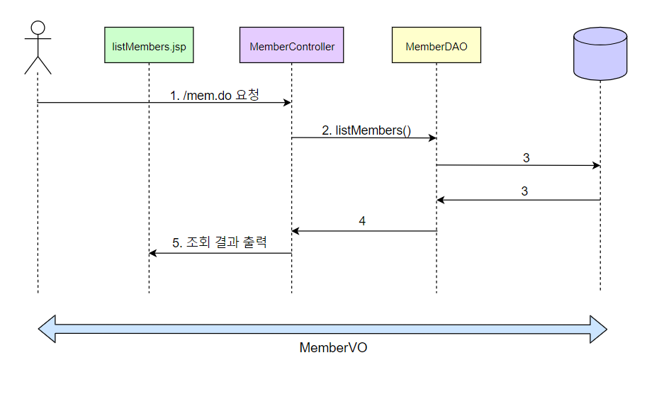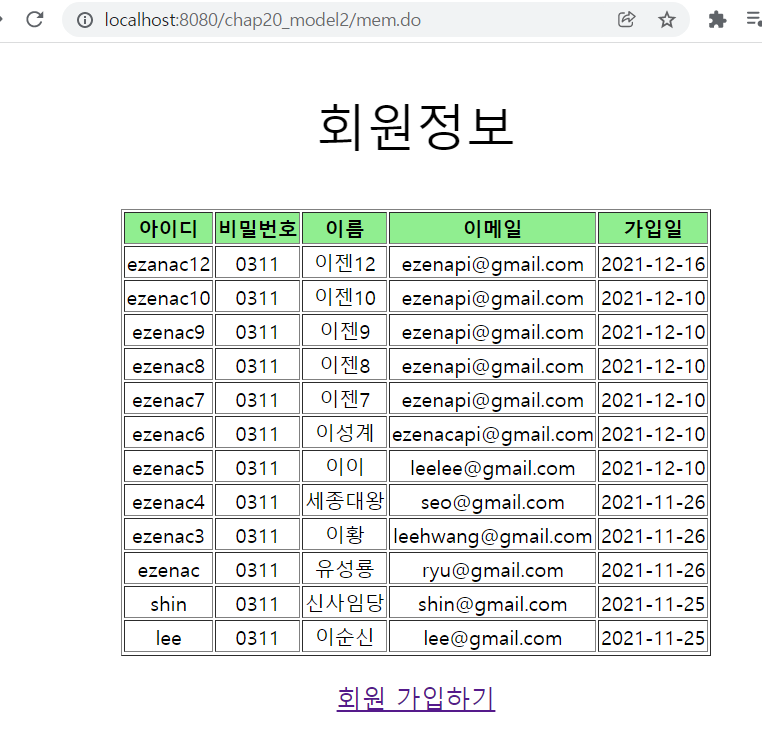 MemberController.java package kr.co.ezenac.member; import java.io.IOException; import java.util.List; import javax.servlet.RequestDispatcher; import javax.servlet.ServletException; import javax.servlet.annotation.WebServlet; import javax.servlet.http.HttpServlet; import javax.servlet.http.HttpServletRequest; import javax.servlet.http.HttpServletResponse; /** * Servlet implementation class MemberController */ @WebServlet("/mem.do") public class MemberController extends HttpServlet { private static final long serialVersionUID = 1L; MemberDAO memberDAO; @Override public void init() throws ServletException { memberDAO = new MemberDAO(); } /** * @see HttpServlet#doGet(HttpServletRequest request, HttpServletResponse response) */ protected void doGet(HttpServletRequest request, HttpServletResponse response) throws ServletException, IOException { doHandler(request, response); } /** * @see HttpServlet#doPost(HttpServletRequest request, HttpServletResponse response) */ protected void doPost(HttpServletRequest request, HttpServletResponse response) throws ServletException, IOException { doHandler(request, response); } private void doHandler(HttpServletRequest request, HttpServletResponse response) throws ServletException, IOException { request.setCharacterEncoding("utf-8"); response.setContentType("text/html; charset=utf-8"); List<MemberVO> membersList = memberDAO.listMembers(); //요청에 대한 회원 정보를 조회함 request.setAttribute("membersList", membersList); //조회한 회원 정보를 request에 바인딩함 //컨트롤러에서 해당 결괄르 표시할 JSP로 포워딩함 RequestDispatcher dispatcher = request.getRequestDispatcher("/member/listmembers.jsp"); dispatcher.forward(request, response); } }MemberDAO.java package kr.co.ezenac.member; import java.sql.Connection; import java.sql.Date; import java.sql.PreparedStatement; import java.sql.ResultSet; import java.util.ArrayList; import java.util.List; import javax.naming.Context; import javax.naming.InitialContext; import javax.naming.NamingException; import javax.sql.DataSource; public class MemberDAO { private Connection conn; private PreparedStatement pstmt; private DataSource dataFactory; public MemberDAO() { try { Context ctx = new InitialContext(); Context envContext = (Context)ctx.lookup("java:/comp/env"); //JNDI에 접근하기 위해 기본경로를 지정 //톰캣 context.xml에 설정한 name 값인 jdbc/oracle을 이용해 톰캣이 미리 연결한 DataSource를 받아옴 dataFactory = (DataSource)envContext.lookup("jdbc/oracle"); } catch (NamingException e) { e.printStackTrace(); } } public List<MemberVO> listMembers() { List<MemberVO> membersList = new ArrayList<>(); try { conn = dataFactory.getConnection(); String query = "SELECT * FROM T_MEMBER ORDER BY JOINDATE DESC"; System.out.println(query); pstmt = conn.prepareStatement(query); ResultSet rs = pstmt.executeQuery(); while(rs.next()) { String id = rs.getString("id"); String pwd = rs.getString("pwd"); String name = rs.getString("name"); String email = rs.getString("email"); Date joinDate = rs.getDate("joinDate"); MemberVO memberVO = new MemberVO(id, pwd, name, email, joinDate); membersList.add(memberVO); } rs.close(); pstmt.close(); conn.close(); } catch(Exception e) { System.out.println("회원 조회 중 오류"); e.printStackTrace(); } return membersList; } }MemberVO.java package kr.co.ezenac.member; import java.sql.Date; public class MemberVO { private String id; private String pwd; private String name; private String email; private Date joinDate; public MemberVO() { System.out.println("MemberVO 생성자 호출"); } public MemberVO(String id, String pwd, String name, String email) { this.id = id; this.pwd = pwd; this.name = name; this.email = email; } public MemberVO(String id, String pwd, String name, String email, Date joinDate) { super(); this.id = id; this.pwd = pwd; this.name = name; this.email = email; this.joinDate = joinDate; } public String getId() { return id; } public void setId(String id) { this.id = id; } public String getPwd() { return pwd; } public void setPwd(String pwd) { this.pwd = pwd; } public String getName() { return name; } public void setName(String name) { this.name = name; } public String getEmail() { return email; } public void setEmail(String email) { this.email = email; } public Date getJoinDate() { return joinDate; } public void setJoinDate(Date joinDate) { this.joinDate = joinDate; } }listmembers.jsp <%@ page language="java" contentType="text/html; charset=UTF-8" pageEncoding="UTF-8"%> <%@ taglib prefix="c" uri="http://java.sun.com/jsp/jstl/core" %> <%@ taglib prefix="fmt" uri="http://java.sun.com/jsp/jstl/fmt" %> <% request.setCharacterEncoding("utf-8"); %> <!DOCTYPE html> <html> <head> <meta charset="UTF-8"> <meta name="viewport" content="width=device-width, initial-scale=1.0"> <title>Insert title here</title> <style type="text/css"> .cls1{ font-size: 40px; text-align: center; } .cls2{ font-size: 20px; text-align: center; } </style> </head> <body> <p class="cls1">회원정보</p> <table align="center" border="1"> <tr align="center" bgcolor="lightgreen"> <td width="%"><b>아이디</b></td> <td width="%"><b>비밀번호</b></td> <td width="%"><b>이름</b></td> <td width="%"><b>이메일</b></td> <td width="%"><b>가입일</b></td> </tr> <c:choose> <c:when test="${empty membersList }"> <td colspan="5" align="center"> <b>등록된 회원이 없습니다.</b> </td> </c:when> <c:when test="${!empty membersList }"> <c:forEach var="mem" items="${membersList }"> <tr align="center"> <td>${mem.id }</td> <td>${mem.pwd }</td> <td>${mem.name }</td> <td>${mem.email }</td> <td>${mem.joinDate }</td> </tr> </c:forEach> </c:when> </c:choose> </table> <a href="#"><p class="cls2">회원 가입하기</p></a> </body> </html>