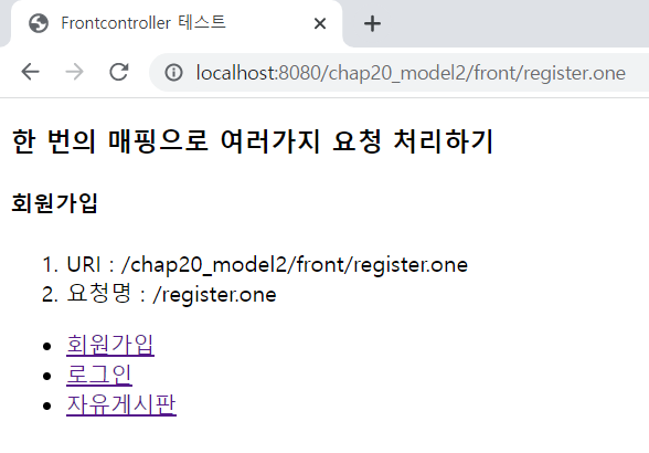 FrontController.java package kr.co.ezenac.front; import java.io.IOException; import javax.servlet.ServletException; import javax.servlet.annotation.WebServlet; import javax.servlet.http.HttpServlet; import javax.servlet.http.HttpServletRequest; import javax.servlet.http.HttpServletResponse; /** * Servlet implementation class FrontController */ @WebServlet("*.one") public class FrontController extends HttpServlet { private static final long serialVersionUID = 1L; /** * @see HttpServlet#doGet(HttpServletRequest request, HttpServletResponse response) */ protected void doGet(HttpServletRequest request, HttpServletResponse response) throws ServletException, IOException { String uri = request.getRequestURI(); int lastSlash = uri.lastIndexOf("/"); String commandStr = uri.substring(lastSlash); if(commandStr.equals("/register.one")) { registFunc(request); } else if(commandStr.equals("/login.one")) { loginFunc(request); } else if(commandStr.equals("/freeboard.one")) { freeboardFunc(request); } request.setAttribute("uri", uri); request.setAttribute("commandStr", commandStr); request.getRequestDispatcher("/front/frontController.jsp").forward(request, response); } private void freeboardFunc(HttpServletRequest request) { request.setAttribute("resultValue", "<h4>자유게시판</h4>"); } private void loginFunc(HttpServletRequest request) { request.setAttribute("resultValue", "<h4>로그인</h4>"); } private void registFunc(HttpServletRequest request) { request.setAttribute("resultValue", "<h4>회원가입</h4>"); } /** * @see HttpServlet#doPost(HttpServletRequest request, HttpServletResponse response) */ protected void doPost(HttpServletRequest request, HttpServletResponse response) throws ServletException, IOException { } }frontController.jsp <%@ page language="java" contentType="text/html; charset=UTF-8" pageEncoding="UTF-8"%> <!DOCTYPE html> <html> <head> <meta charset="UTF-8"> <meta name="viewport" content="width=device-width, initial-scale=1.0"> <title>Frontcontroller 테스트</title> </head> <body> <h3>한 번의 매핑으로 여러가지 요청 처리하기</h3> ${resultValue } <ol> <li>URI : ${uri }</li> <li>요청명 : ${commandStr } </li> </ol> <ul> <li><a href="../front/register.one">회원가입</a></li> <li><a href="../front/login.one">로그인</a></li> <li><a href="../front/freeboard.one">자유게시판</a></li> </ul> </body> </html>