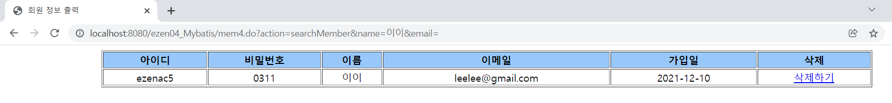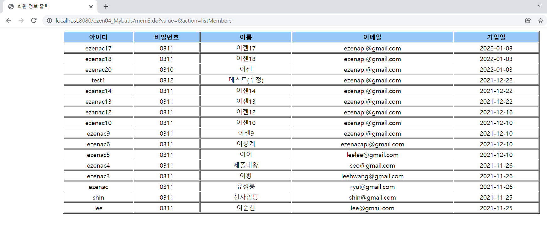 import java.io.IOException; import java.util.List; import javax.servlet.RequestDispatcher; import javax.servlet.ServletException; import javax.servlet.annotation.WebServlet; import javax.servlet.http.HttpServlet; import javax.servlet.http.HttpServletRequest; import javax.servlet.http.HttpServletResponse; import kr.co.ezenac.orm01.MemberVO; /** * Servlet implementation class MemberServlet */ @WebServlet("/mem3.do") public class MemberServlet extends HttpServlet { private static final long serialVersionUID = 1L; /** * @see HttpServlet#doGet(HttpServletRequest request, HttpServletResponse response) */ protected void doGet(HttpServletRequest request, HttpServletResponse response) throws ServletException, IOException { doHandle(request, response); } /** * @see HttpServlet#doPost(HttpServletRequest request, HttpServletResponse response) */ protected void doPost(HttpServletRequest request, HttpServletResponse response) throws ServletException, IOException { doHandle(request, response); } private void doHandle(HttpServletRequest request, HttpServletResponse response) throws ServletException, IOException { request.setCharacterEncoding("utf-8"); response.setContentType("text/html; charset=utf-8"); MemberDAO dao = new MemberDAO(); MemberVO memberVO = new MemberVO(); String action = request.getParameter("action"); String forwardPage = ""; if(action == null || action.equals("listMembers")) { List<MemberVO> membersList = dao.selectAllMembersList(); request.setAttribute("membersList", membersList); forwardPage = "orm02/listMembers.jsp"; } else if(action.equals("selectMemberById")) { String id = request.getParameter("value"); memberVO = dao.selectMemberById(id); request.setAttribute("member", memberVO); forwardPage = "orm02/memberInfo.jsp"; } else if(action.equals("selectMemberByPwd")) { int pwd = Integer.parseInt(request.getParameter("value")); List<MemberVO> membersList = dao.selectMemberByPwd(pwd); request.setAttribute("membersList", membersList); forwardPage = "orm02/listMembers.jsp"; } RequestDispatcher dispatcher = request.getRequestDispatcher(forwardPage); dispatcher.forward(request, response); } }listMembers.jsp