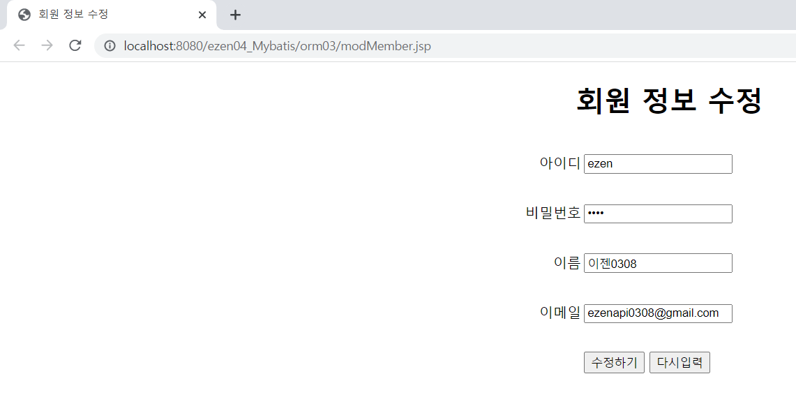 package kr.co.ezenac.orm02; import java.io.IOException; import java.io.Reader; import org.apache.ibatis.io.Resources; import org.apache.ibatis.session.SqlSession; import org.apache.ibatis.session.SqlSessionFactory; import org.apache.ibatis.session.SqlSessionFactoryBuilder; public class MemberDAO { public static SqlSessionFactory sqlMapper = null; public static SqlSessionFactory getInstance() { if(sqlMapper == null) { String resource = "mybatis/SqlMapConfig.xml"; //설정 정보를 읽은 후 DB와의 연동 준비함 try { Reader reader = Resources.getResourceAsReader(resource); //마이바티스를 이용하는 sqlMapper 객체를 가져옴 sqlMapper = new SqlSessionFactoryBuilder().build(reader); reader.close(); } catch (IOException e) { e.printStackTrace(); } } return sqlMapper; } public String selectName() { sqlMapper = getInstance(); SqlSession session = sqlMapper.openSession(); //selectOne() 메서드로 인자로 지정한 SQL문을 실행한 후 한 개의 데이터(문자열)를 반환함 String name = session.selectOne("mapper.member.selectName"); return name; } public int selectPwd() { sqlMapper = getInstance(); SqlSession session = sqlMapper.openSession(); //selectOne() 메서드로 인자로 지정한 SQL문을 실행한 후 한 개의 데이터(정수)를 반환함 int pwd = session.selectOne("mapper.member.selectPwd"); return pwd; } }MemberServlet.java