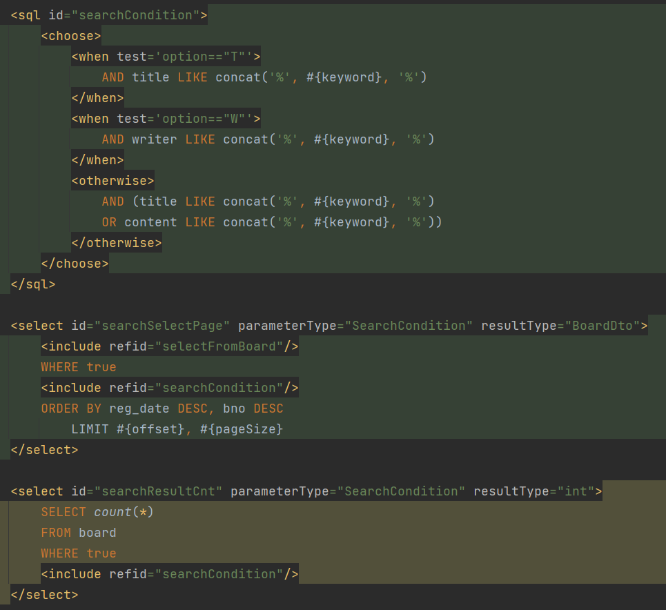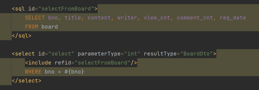 공통 부분을 <sql>로 정의하고 <include>로 포함시켜 재사용 가능
