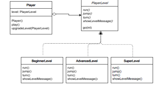 /* * - Player라는 클래스가 있고 PlayerLevel 속성을 가짐 * - 각 GameLevel 단계마다 run(), jump(), turn() 세 가지 기능이 업그레이드 됨 * - 초보자(BeginnerLevel) 레벨 : "천천히 달립니다. jump 못합니다. turn 못해요." run()만 가능 * - 중급자(IntermediateLevel) 레벨 : "빨리 달립니다. 높이 jump 합니다. turn 못해요." run()과 jump() 가능 * - 고급자(AdvancedLevel) 레벨 : "엄청 빠르게 달립니다. 아주 높이 jump합니다. 아주 높이 jump합니다. 아주 높이 jump합니다. turn 합니다." run(), jump(), turn() 가능 * * - Player는 한 번에 하나의 레벨 상태만 가질 수 있음 * - Player가 Player()중에 레벨에 있는 go(int count)라는 메서드를 호출하면 run()하고 count만큼 jump()하고 turn() 메서드를 호출 합니다. * - 클래스 다이어그램을 참고하여 각 레벨에서 go()가 호출될 때 아래 예시처럼 출력되도록 구현하세요. * * ***********초급자 레벨입니다.*********** * 천천히 달립니다. * jump 못합니다. * turn 못해요. * ***********중급자 레벨입니다.*********** * 빨리 달립니다. * 높이 jump 합니다. 높이 jump 합니다. * turn 못해요. * ***********고급자 레벨입니다.*********** * 엄청 빠르게 달립니다. * 아주 높이 jump합니다. * 아주 높이 jump합니다. * 아주 높이 jump합니다. * turn 합니다. */ public abstract class PlayerLevel { public abstract void showLevelMessage(); public abstract void run(); public abstract void jump(); public abstract void turn(); public final void go(int count) { run(); for(int i=0; i<count; i++) { jump(); } turn(); } }public class Player { private PlayerLevel level; public Player() { level = new BeginnerLevel(); level.showLevelMessage(); } public void upgreadeLevel(PlayerLevel level) { this.level = level; level.showLevelMessage(); } public void play(int count) { level.go(count); } }// 초급자 public class BeginnerLevel extends PlayerLevel { @Override public void showLevelMessage() { System.out.println("***********초급자 레벨입니다.***********"); } @Override public void run() { System.out.println("천천히 달립니다. "); } @Override public void jump() { System.out.println("jump 못합니다. "); } @Override public void turn() { System.out.println("turn 못해요."); } }// 중급자 public class IntermediateLevel extends PlayerLevel { @Override public void showLevelMessage() { System.out.println("***********중급자 레벨입니다.***********"); } @Override public void run() { System.out.println("빨리 달립니다. "); } @Override public void jump() { System.out.println("높이 jump 합니다."); } @Override public void turn() { System.out.println("turn 못해요."); } }// 고급자 public class AdvancedLevel extends PlayerLevel { @Override public void showLevelMessage() { System.out.println("***********고급자 레벨입니다.***********"); } @Override public void run() { System.out.println("엄청 빠르게 달립니다. "); } @Override public void jump() { System.out.println("아주 높이 jump합니다."); } @Override public void turn() { System.out.println("turn 합니다."); } }public class PlayerLevelTest { public static void main(String[] args) { Player player = new Player(); player.play(1); IntermediateLevel iLevel = new IntermediateLevel(); player.upgreadeLevel(iLevel); player.play(2); AdvancedLevel aLevel = new AdvancedLevel(); player.upgreadeLevel(aLevel); player.play(3); } }